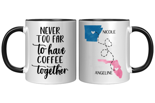 Never Too Far To Have Coffee Together Tumbler - Long Distance Friendship Personalized Gift - Best Friend State To State Mug