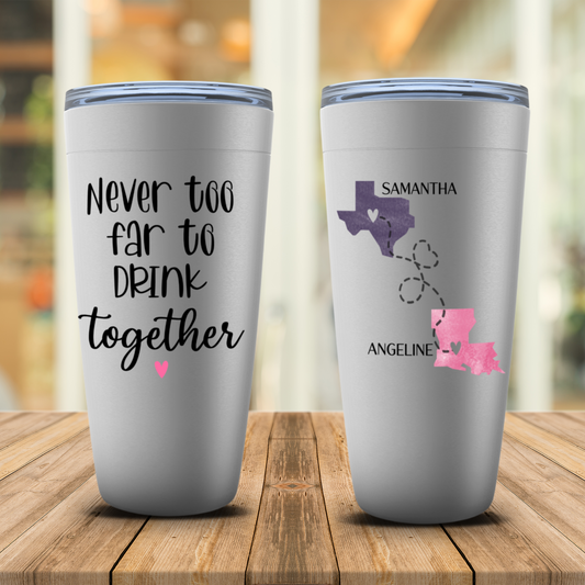 Never Too Far To Drink Together Tumbler - Personalized Long Distance Friendship Gift - Sister State To State Cup