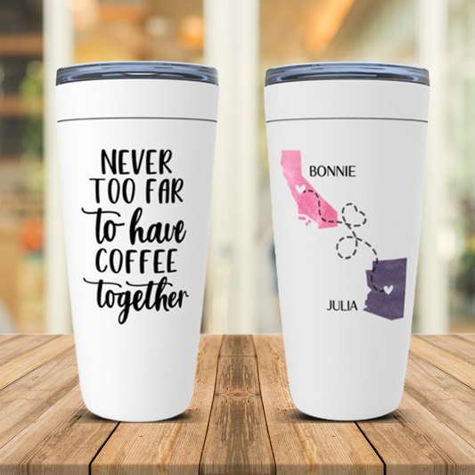 Never Too Far To Have Coffee Together Tumbler - Long Distance Friendship Personalized Gift - Best Friend State To State Mug