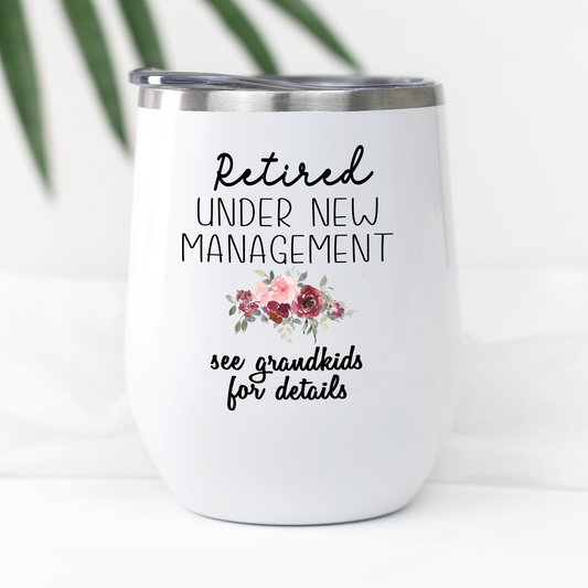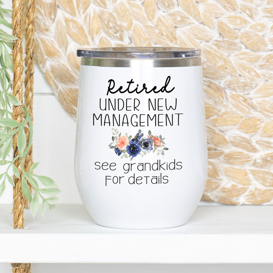 Retired Under New Management See Grandkids For Details Funny Wine Tumbler - Personalized Retirement Gift For Women